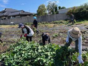 芋掘り前のツタを刈り、芋掘りがしやすいようにしていただきます。