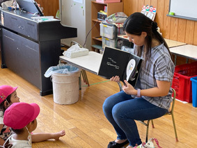 お子様の前で絵本の読み聞かせをしていただきます。最初は緊張しますが何回もしたくなるようです。